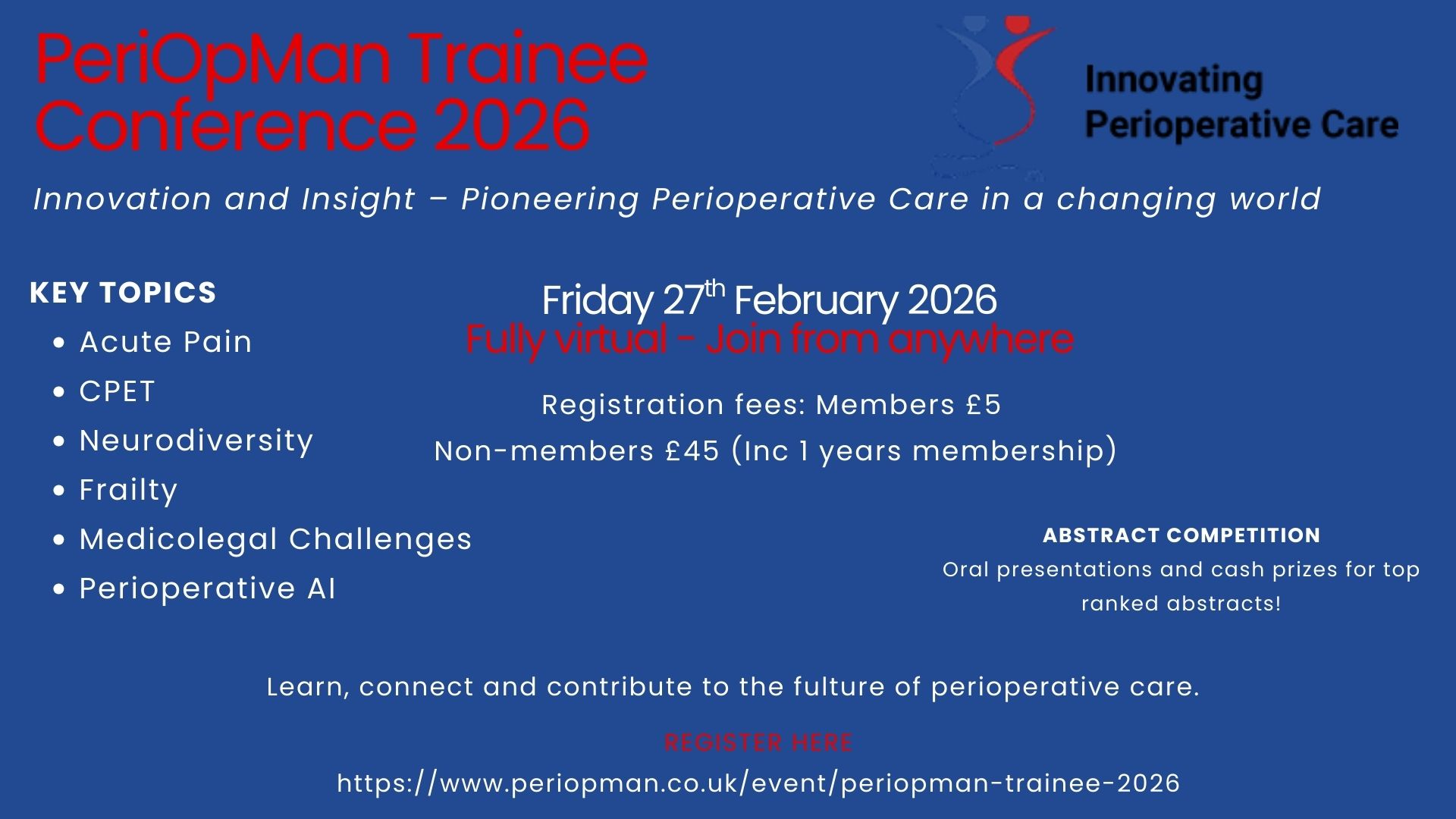 The Manchester Perioperative Medicine Society invites submissions for the abstract competition at the Perioperative Medicine Trainee Conference, to be held on 27 February 2026.